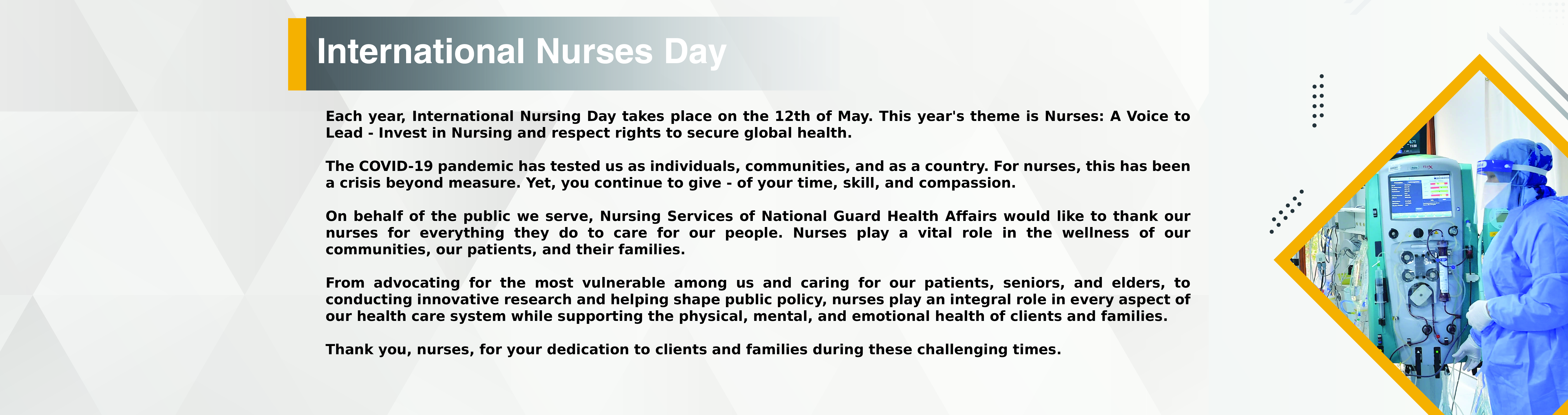 بمناسبة اليوم العالمي للتمريض والذي يوافق 12 مايو تتقدم الشؤون الصحية بأسمى آيات التقدير والعرفان للممرضين والممرضات المنتسبين إلى هذه المهنة.