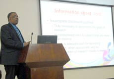 وأشار الدكتور القرني إلى أن "المحاضر أكد على أن هناك لجان علمية ضامنة للقيام ببحث ملتزم بالأخلاق والمعايير الإنسانية"، مضيفاً "المعايير الدولية المتفق عليها تندرج تحت احترام ذات الفرد المشاركة في البحث، وعدم التسبب بأي ضرر أو إيذاء الصحة النفسية أو العضوية، وأن تكون مصلحة المشارك في البحث هي الهاجس الأول والأخير، وتحقيق العدالة بحيث يكون لكل مشارك نفس الفرص في قبول الإيجابيات والسلبيات في البحث".