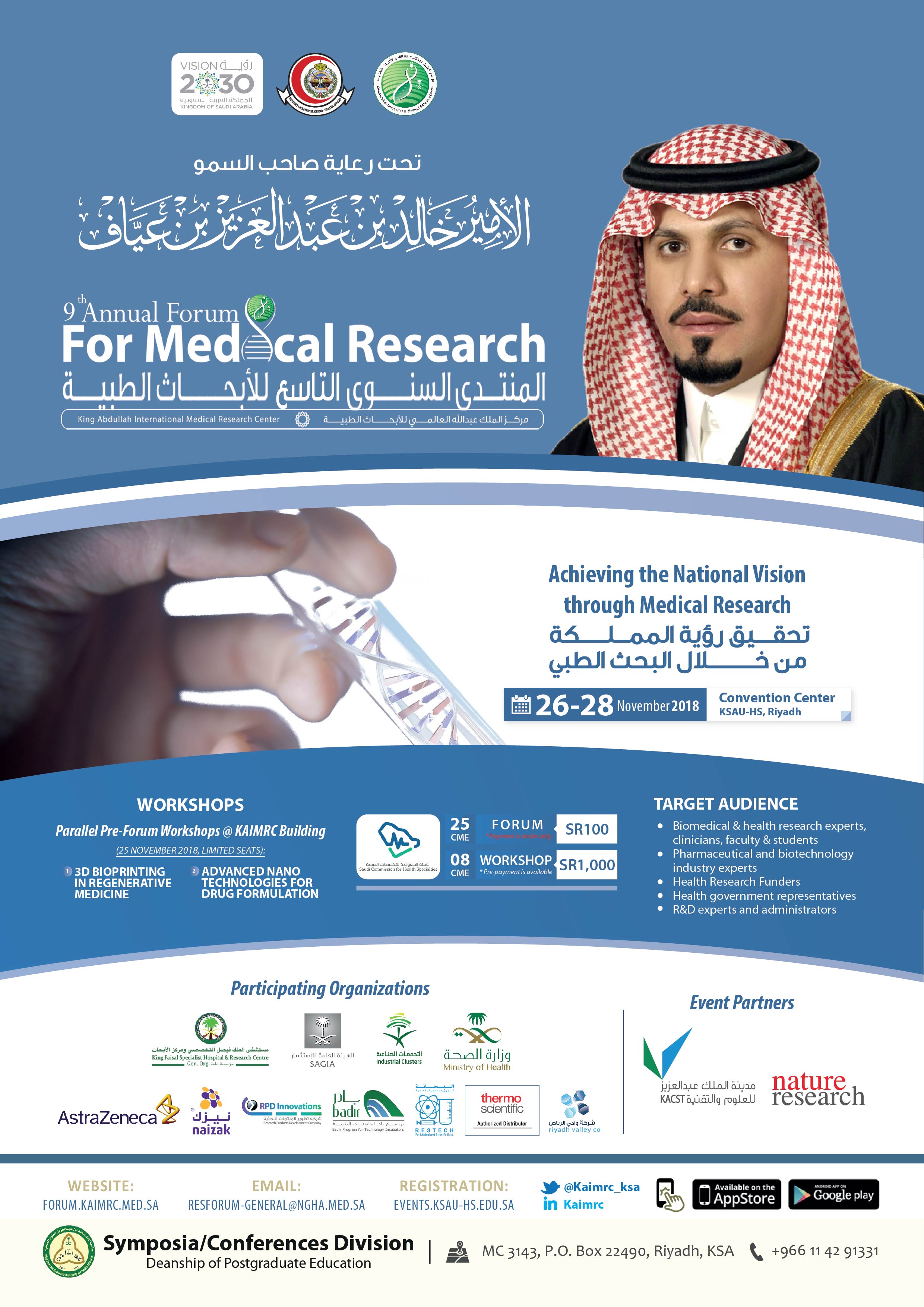 يرعى صاحب السمو الامير خالد بن عبدالعزيز بن عياف وزير الحرس الوطني المنتدى السنوي التاسع للأبحاث الطبية تحت شعار "تحقيق رؤية المملكة من خلال البحث الطبي"، والذي ينظمه مركز الملك عبدالله العالمي للأبحاث الطبية بالشؤون الصحية بوزارة الحرس الوطني، وذلك خلال الفترة من 18 – 20 ربيع الأول 1440هـ الموافق 26 – 28 نوفمبر 2018م في مركز المؤتمرات بجامعة الملك سعود بن عبدالعزيز للعلوم الصحية بالرياض.