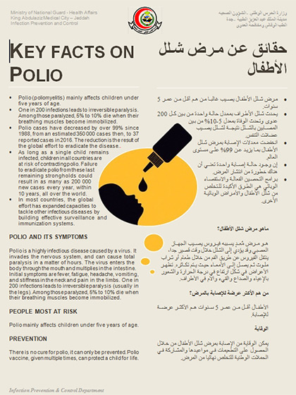 اختتمت حملة التطعيم ضد شلل الأطفال التي نظمتها إدارة الطب الوقائي ومكافحة العدوى بمدينة الملك عبدالعزيز الطبية بجدة تضامناً وبالتعاون مع الحملة الوطنية لوزارة الصحة تحت شعار" قطرتان بالفم تحمي طفلك من الإصابة بشلل الأطفال " بدأت الحملة في عيادة الموظفين بالمستشفى وعيادة جامعة الملك سعود بن عبدالعزيز للعلوم الصحية - فرع جدة وإدارة مراكز الرعاية الصحية الأولية التابعة بالشؤون الصحية بالقطاع الغربي ، واستمرت لمدة 5 أيام، هدفت إلى التوعية والوقاية من شلل الأطفال للأطفال الذين تتراوح اعمارهم بين السنة الى 5 سنوات.