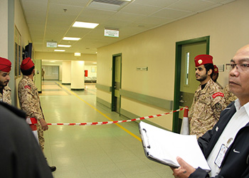 تم إخلاء المنطقة بالكامل والحرص على مقاييس السلامة من قبل الشرطة العسكرية وتم استدعاء جميع الإدارات المعنية منها إدارة الإطفاء ممثلة برئيس القسم الأستاذ علي العلي و إدارة السلامة ممثلة بالمشرف الأستاذ جمال الشعار والاستاذ سعيد الدوسري المدير التنفيذي المشارك لخدمات المرضى.