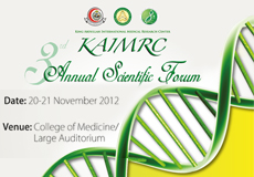 King Abdullah International Medical Research Center will hold the 3rd KAIMRC Annual Forum Year 2012 "Our Institutional Research: Moving Forward" at the College of Medicine, Large Auditorium, King Saud bin Abdulaziz University for Health Sciences, National Guard Health Affairs- Riyadh on the 20th - 21st of November, 2012 where a number of international and local experts and researchers will participate.