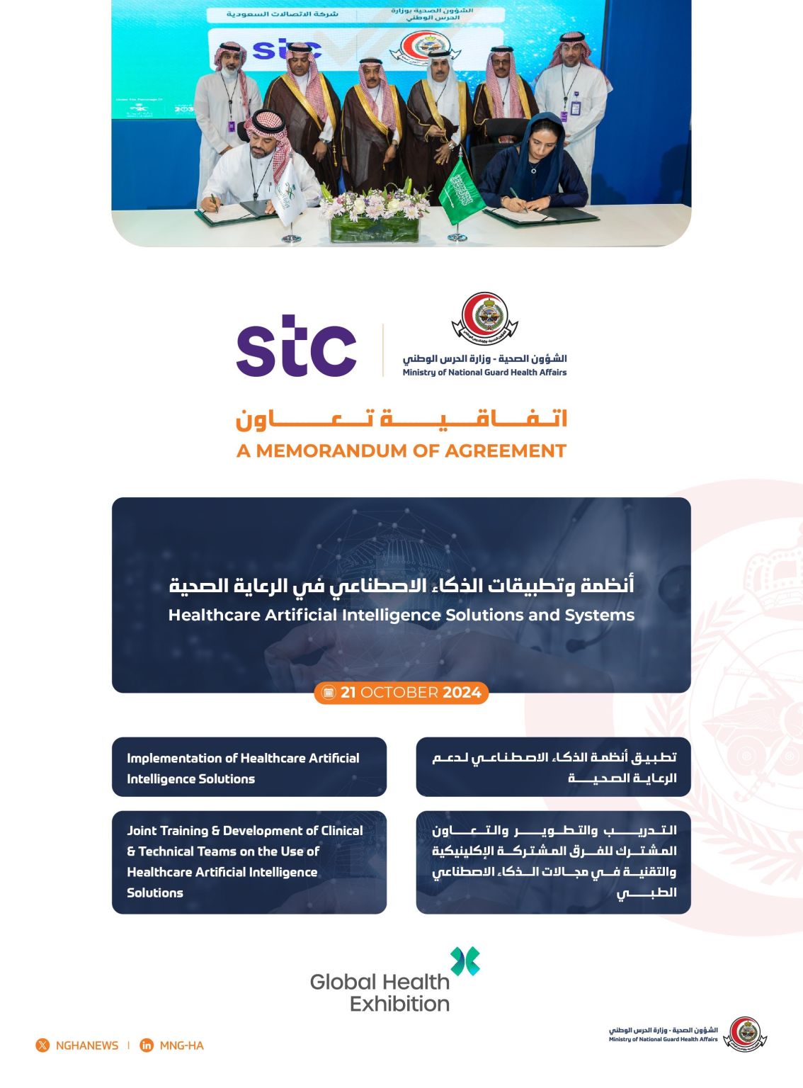 Under the patronage of His Excellency the Executive Director General, Dr. Bandar Al-Knawy, and His Excellency the CEO of STC Group, Eng. Ulaiyan Al-Wetaid, and in a strategic move to promote innovation in the healthcare sector, the Ministry of National Guard Health Affairs, represented by the Executive Director of Medical Strategy, Dr. Azza Al-Thamiri, and STC Group, represented by the Vice President of Government Sales for the Business Unit, Mr. Faisal Al-Bakri, signed a pioneering cooperation agreement in the field of artificial intelligence systems and applications in healthcare during the Global Health Forum 2024. This agreement aims to integrate advanced artificial intelligence technologies into healthcare services, contributing to improving the quality of care provided to patients and enhancing operational efficiency. Through this partnership, both parties seek to develop innovative solutions that meet the needs of society and contribute to improving health outcomes, reflecting their shared commitment to providing the best levels of healthcare.