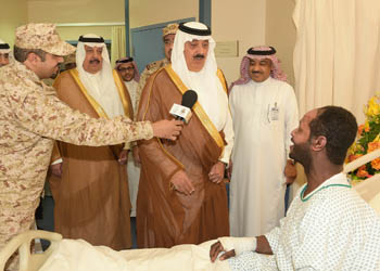 His Royal Highness Prince Miteb bin Abdullah bin Abdulaziz, Minister of National Guard, accompanied by His Excellency Abdulmohsen Al-Tuwaijri, Deputy Minister of National Guard paid a visit to some of the injured troops of National Guard who are receiving treatment at King Abdulaziz Medical City – Riyadh after sustaining some injuries during confrontations at the southern border region such as Jazan and Najran and were evacuated to King Abdulaziz Medical City in Riyadh. Prince Miteb was received by H.E. Chief Executive Officer of Ministry of National Guard - Health Affairs, President of King Saud bin Abdulaziz University for Health Sciences, Dr. Bandar Al Knawy and Dr. Saad Al Mehrij, Chief Medical Officer of the Ministry of National Guard - Health Affairs.