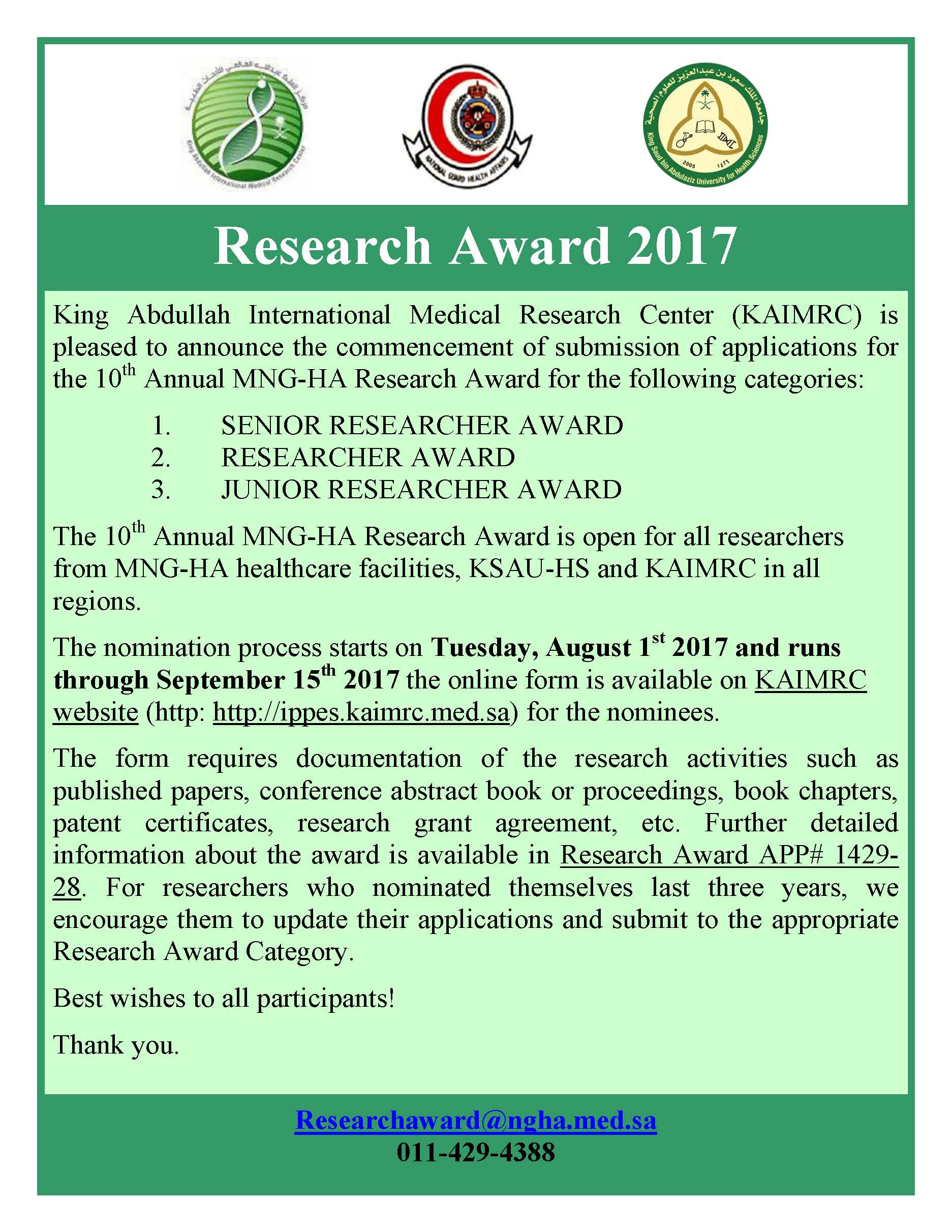 For inquiries, please call +966-11-429-4388 or email us at researchaward@ngha.med.sa