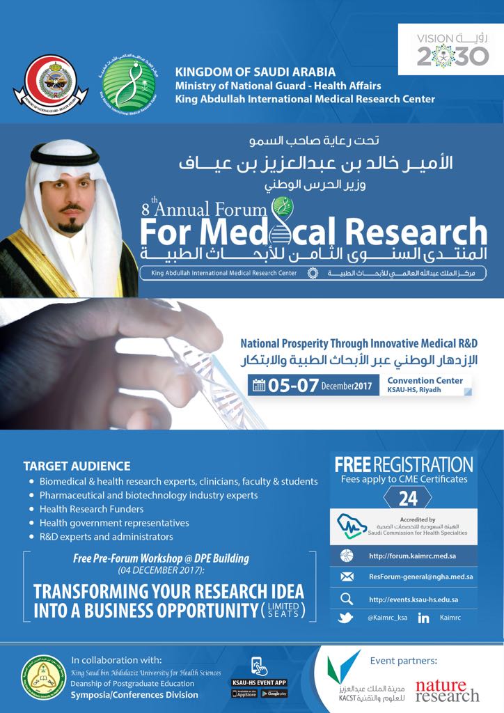 Under the auspices of His Highness Prince Khalid bin Abdulaziz bin Mohamed bin Eyaf, Minister of National Guard – Health Affairs, King Abdullah International Medical Research Center (KAIMRC) will host the 8th Annual Forum for Medical Research with the title “National Prosperity Through Innovative Medical R&D ”. The forum will be held from the 5th till the 7th of December, 2017 in King Saud bin Abdulaziz University for Health Sciences - Convention Center.