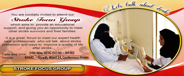 As Stroke has physical, emotional and psychological impact, the Stroke Focus Group at KAMC, MNG-HA is pleased to invite stroke patients, caregivers and their families to the stroke Focus Group that aims to provide support to stroke patients through advice and education focusing on stroke symptoms. The stroke Focus Group includes a lecture and an open discussion. It will also provide an opportunity for the invitees to ask questions to expert physicians, nurses and multidisciplinary team regarding their concerns and issues of stroke and preventative measures.