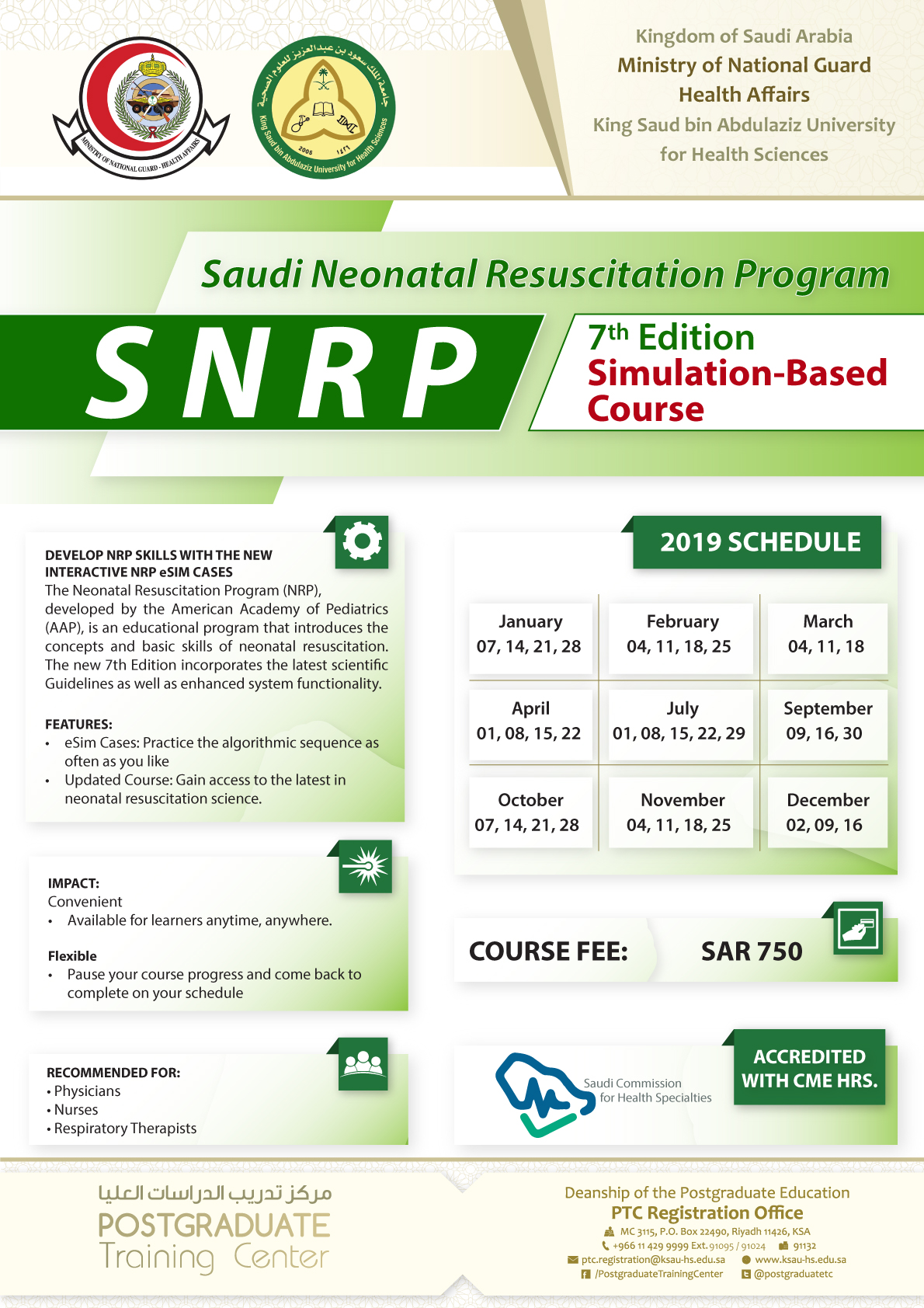 Fee:750.00 SAR includes NRP online key.Target Audience Physicians, Nurses and Respiratory Therapist.CME Hours:This course is accredited with CME Hours from the Saudi Commission for Health Specialties (SCHS).For more information and registration, find attached Poster and call: PTC Registration Office, 2nd Floor, Deanship of Postgraduate Education Bldg. Tel. No.: +966-11429 1111 Ext. 91024Fax No.:+966-11429 1111 Ext. 91132Email: ptc.registration@ksau-hs.edu.sa